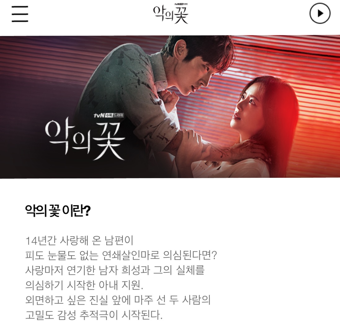 '악의꽃'은 가장 가까운 사람에 대해 모른채 살아가고 있을지 모를 우리들의 단편인듯 싶어 호기심이 간다.