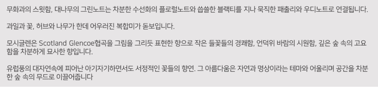 모시글렌보다 더 길게 남는 잔향이 그래서 시간이 지나면 더 좋은 느낌의 향이다.