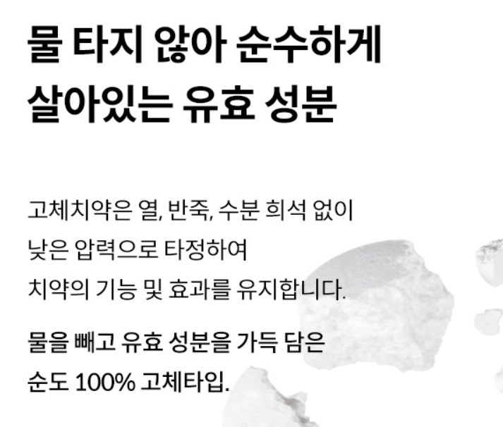 고체치약은 물 없이 입안에 넣고 살살 쪼개다보면 입안 가득 작은입자의 거품이 일어난다.