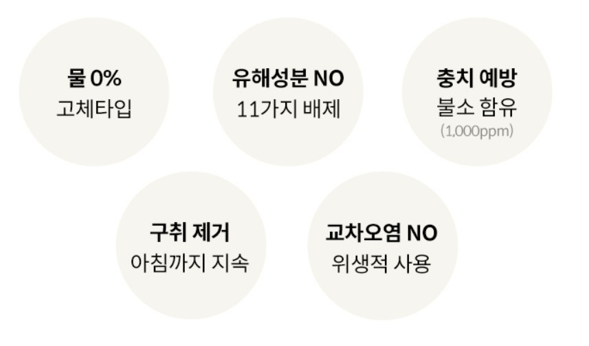 물 묻은 손으로 고체치약 한알을 꺼낼때 잘못 하면 다른 치약에 물이 묻을까 조심하게 된다.