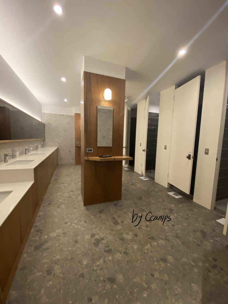 늘 깔끔하게 관리되는 개수대, 깨끗한 화장실, 1인 샤워실 및 비치되어 있던 다이슨 드라이어기.