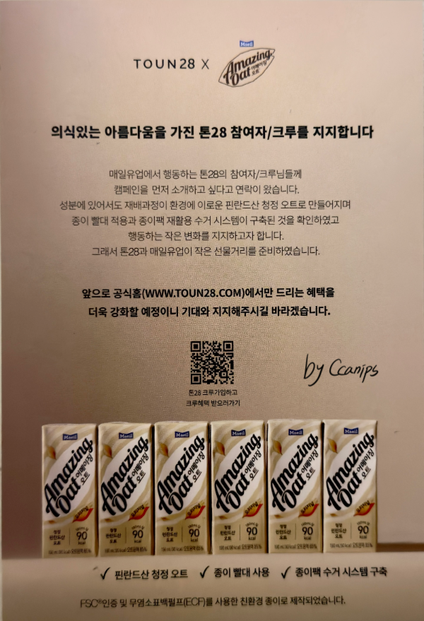 #톤28 크루선물 #매일 어메이징 오트 #비건인증 음료 #종이빨대좋아