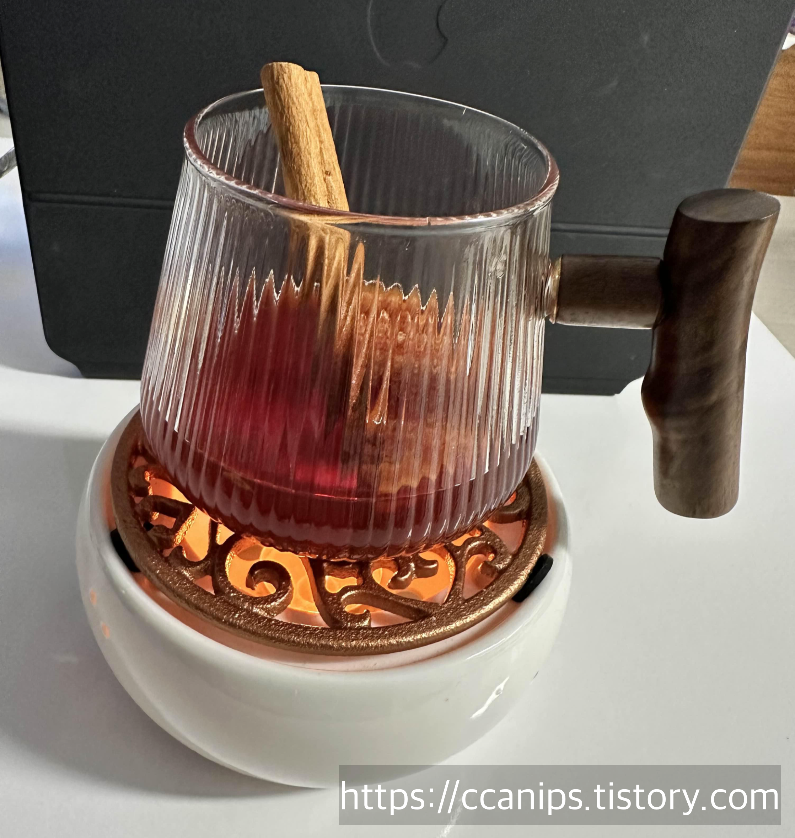 내열유리라서 워머에 올려두고 따뜻하게 마실수 있어 좋다.