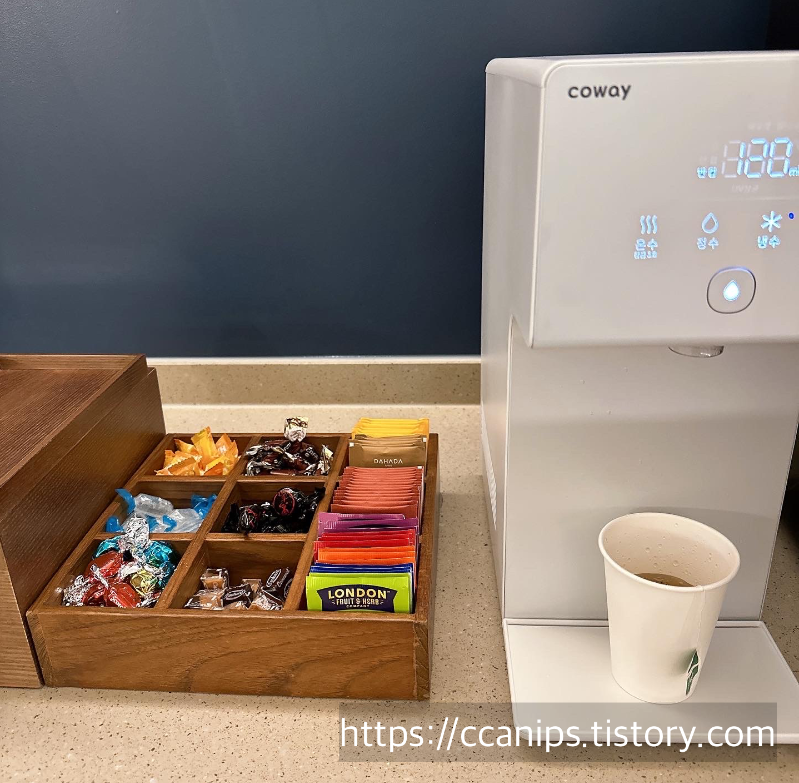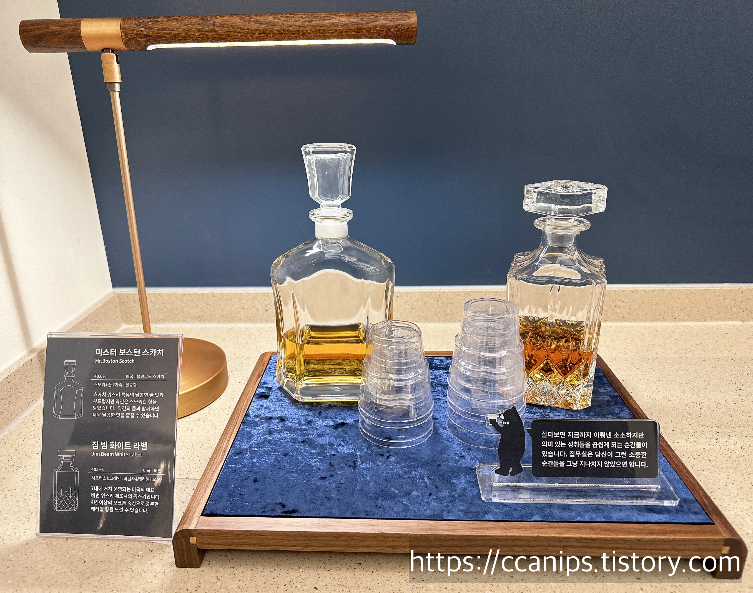 커피, 티, 사탕, 스카치가 준비되어 있다.