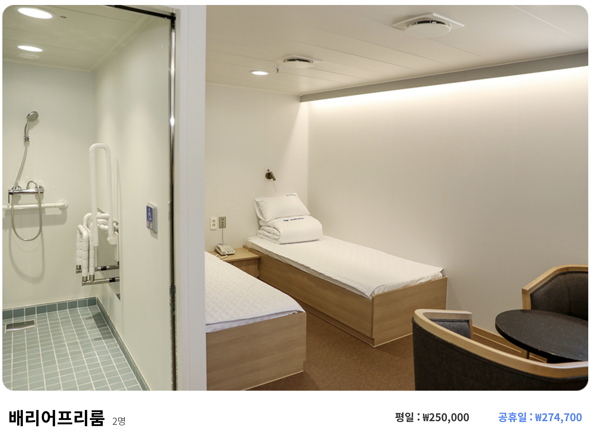 | 베리어프리룸 | 2명 | 침대 | 250,000 | 237,700 | 274,700 | 261,100 |