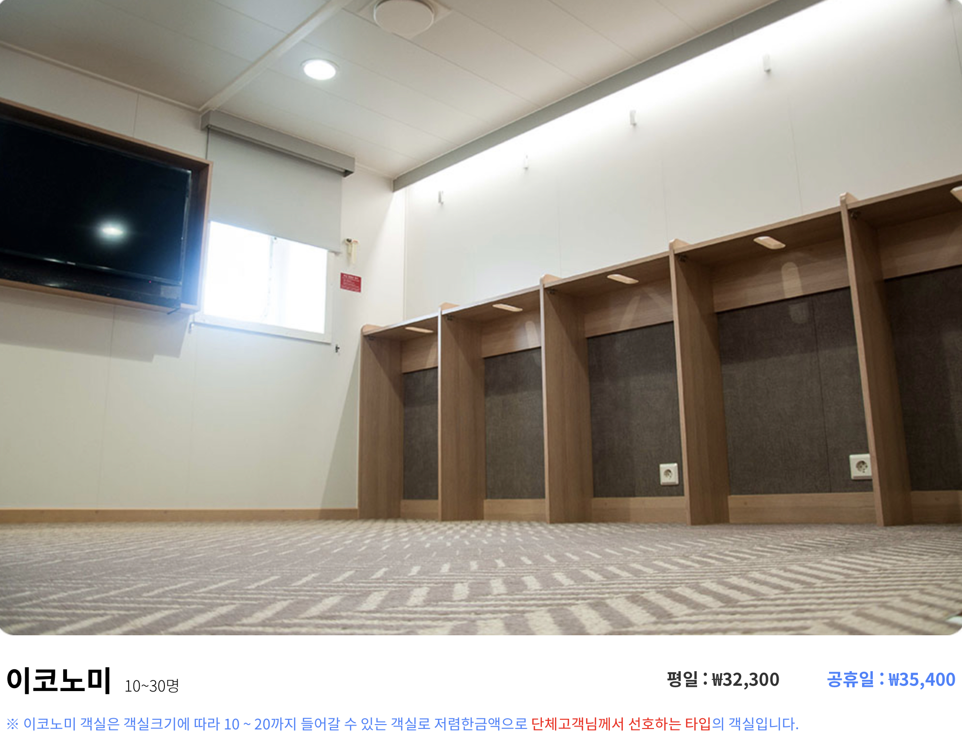 | 이코노미실 | 10~30명 | 객실 | 32,300 | 30,800 | 35,400 | 33,800 |