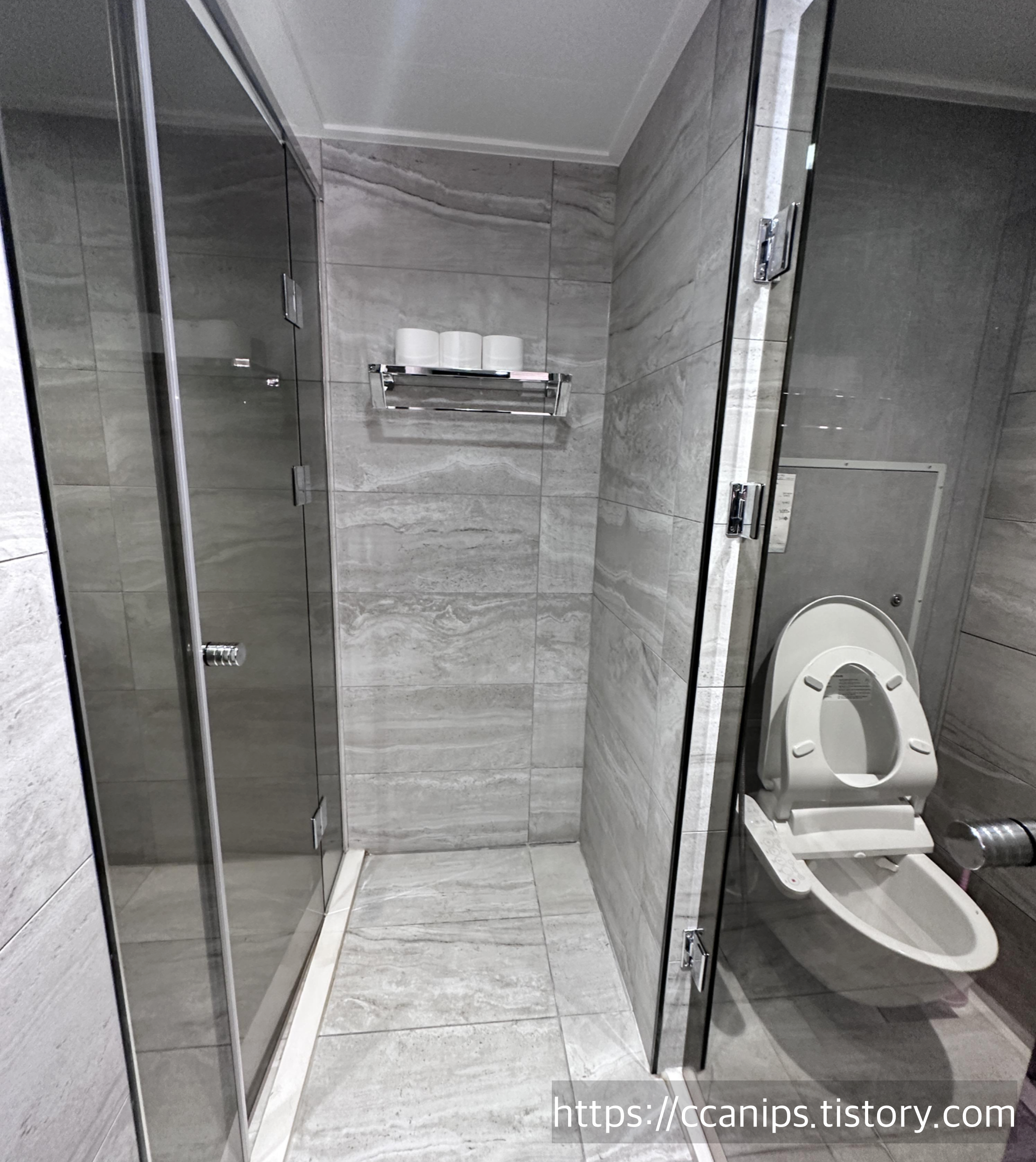 왼쪽에 샤워부스가 오른쪽에 화장실.