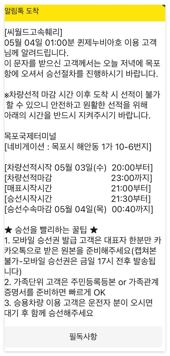 씨월드 고속훼리에 당일 알림톡이 도착한다.