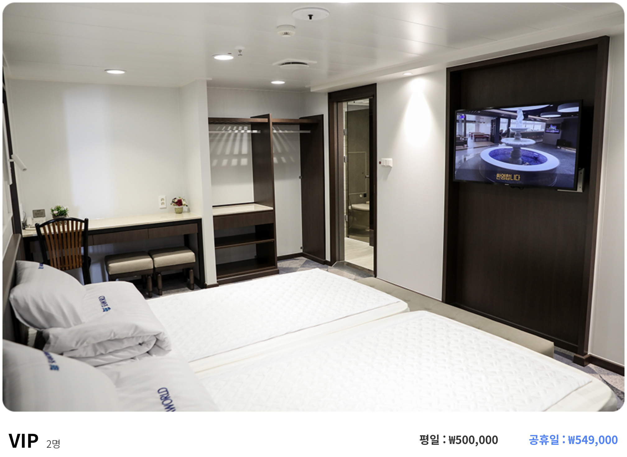 | VIP룸 | 2명 | 침대 | 500,000 | 475,200 | 549,000 | 522,400 |