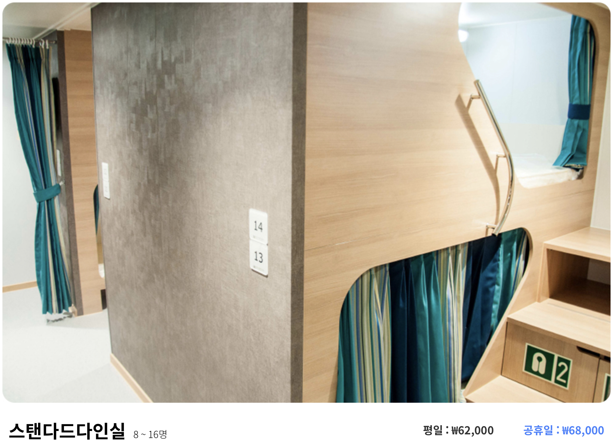 | 다인침대실 | 8~16명 | 침대 | 62,000 | 59,000 | 68,000 | 64,700 |
