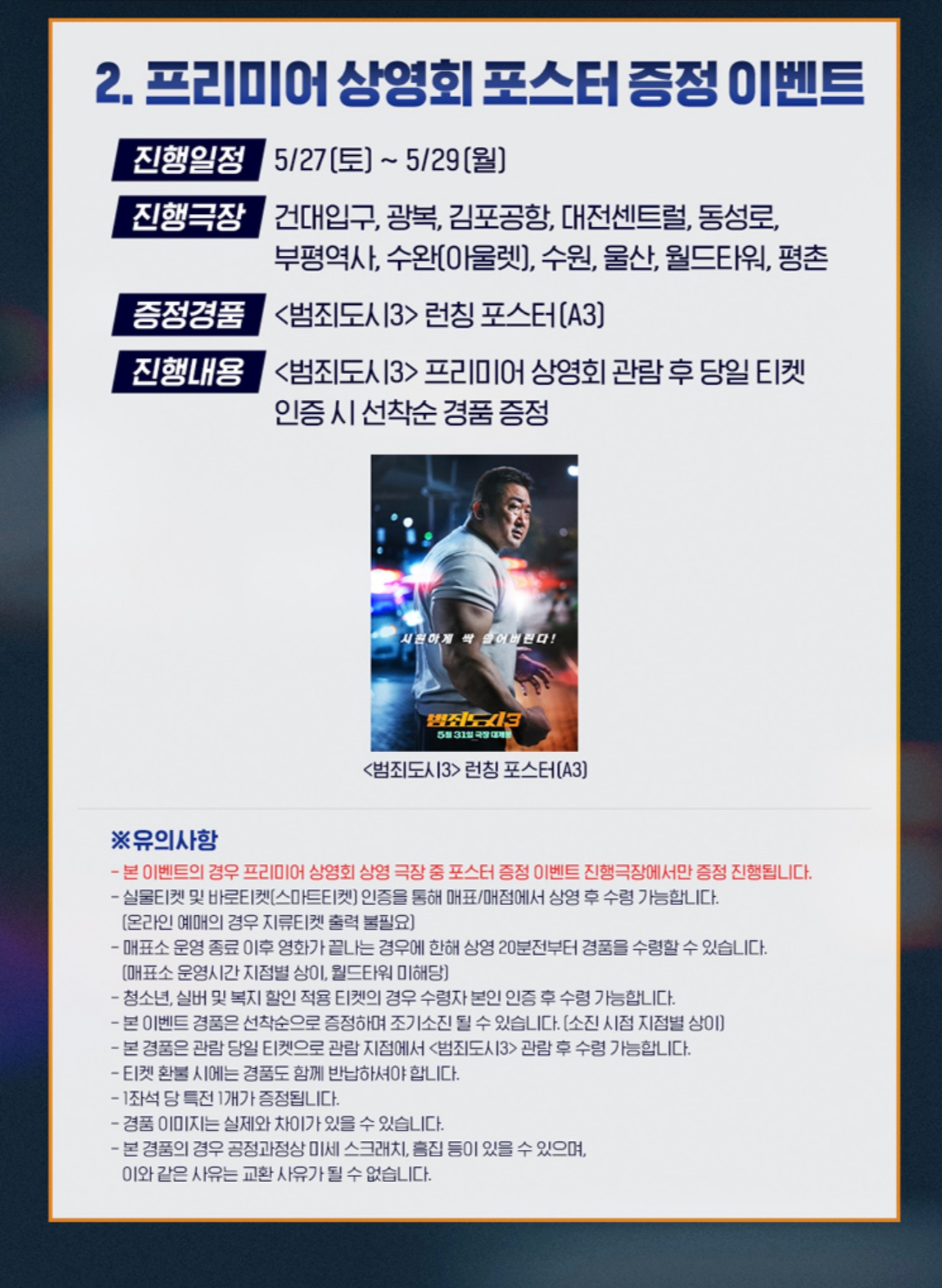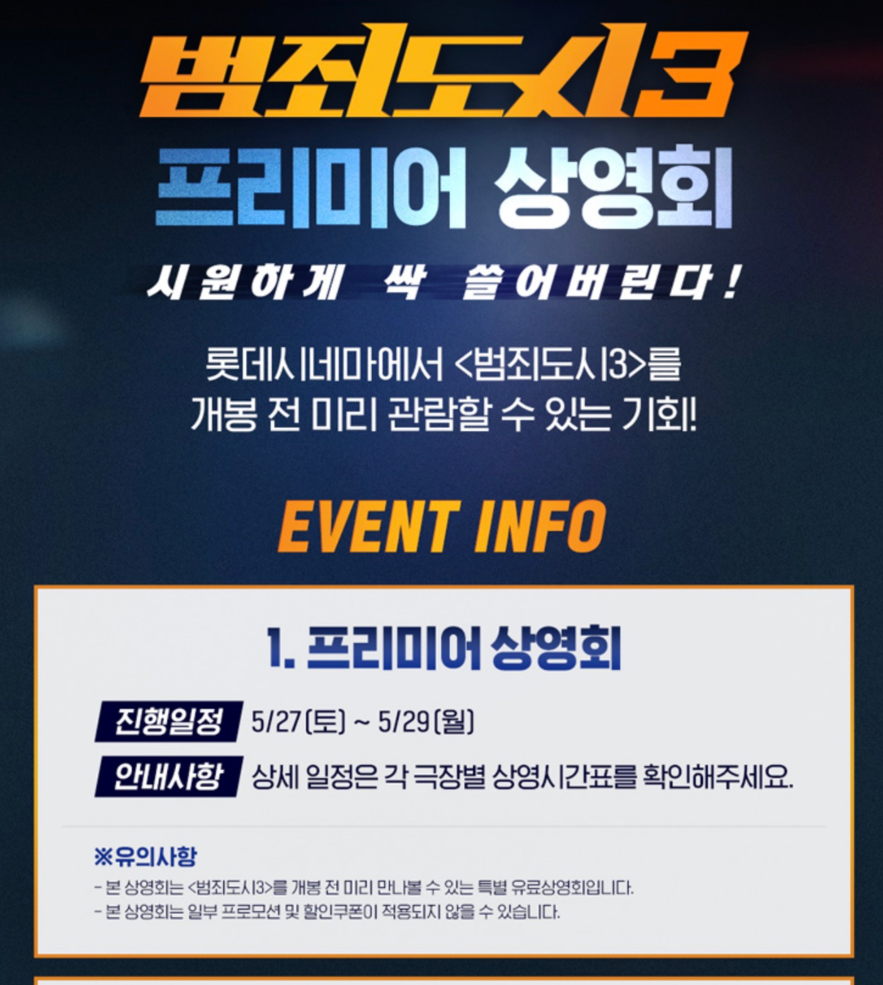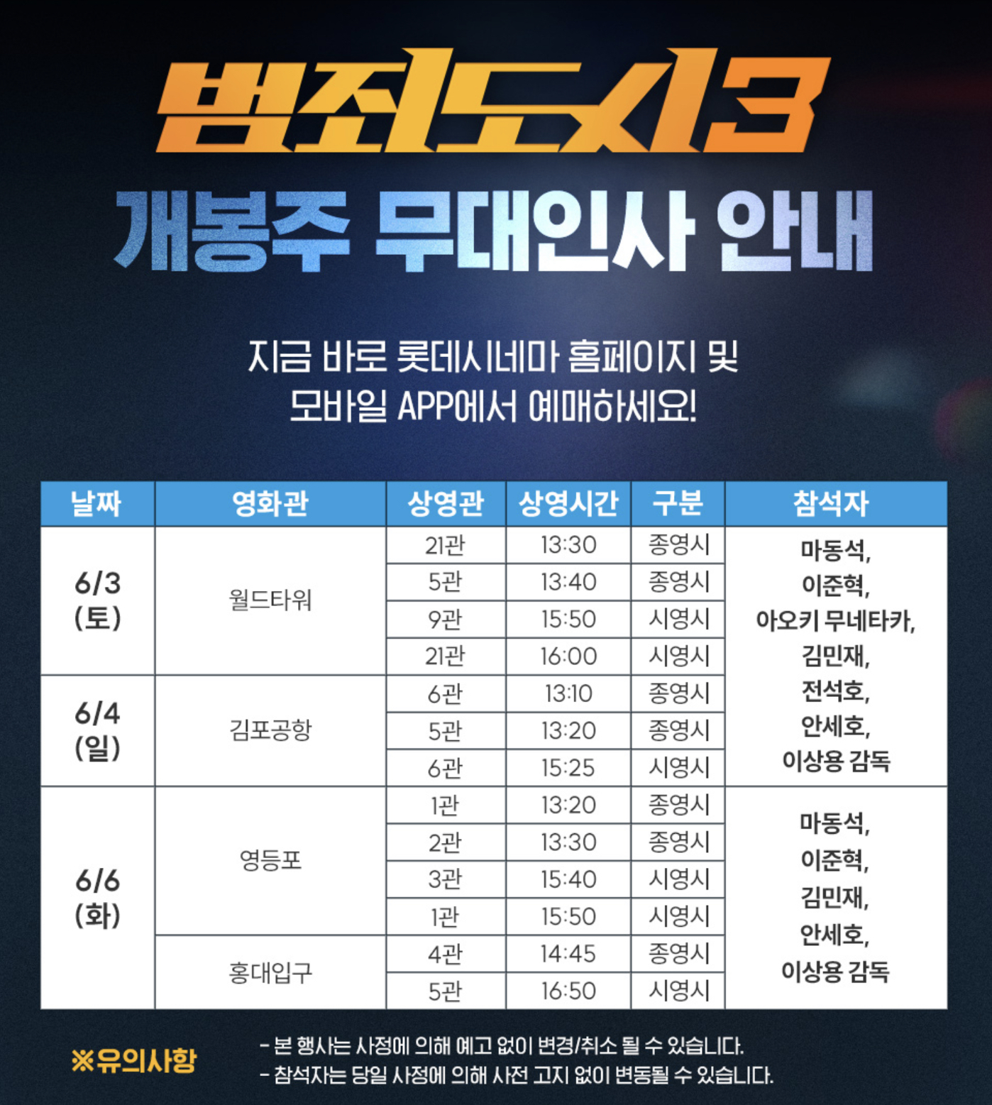 롯데시네마 범죄도시 무대인사도 아래와 같이 진행한다고 하니