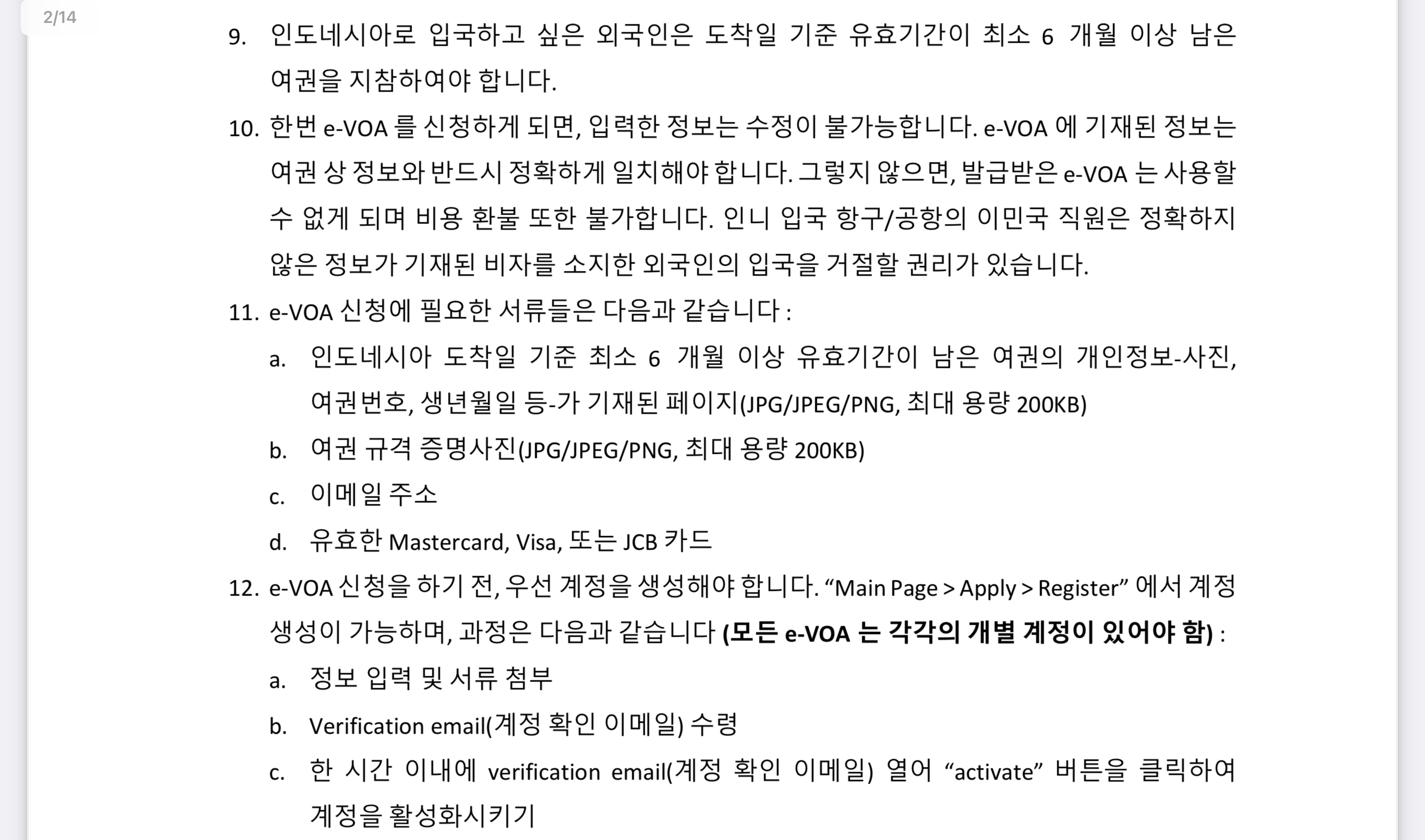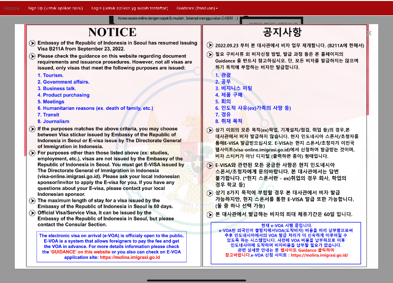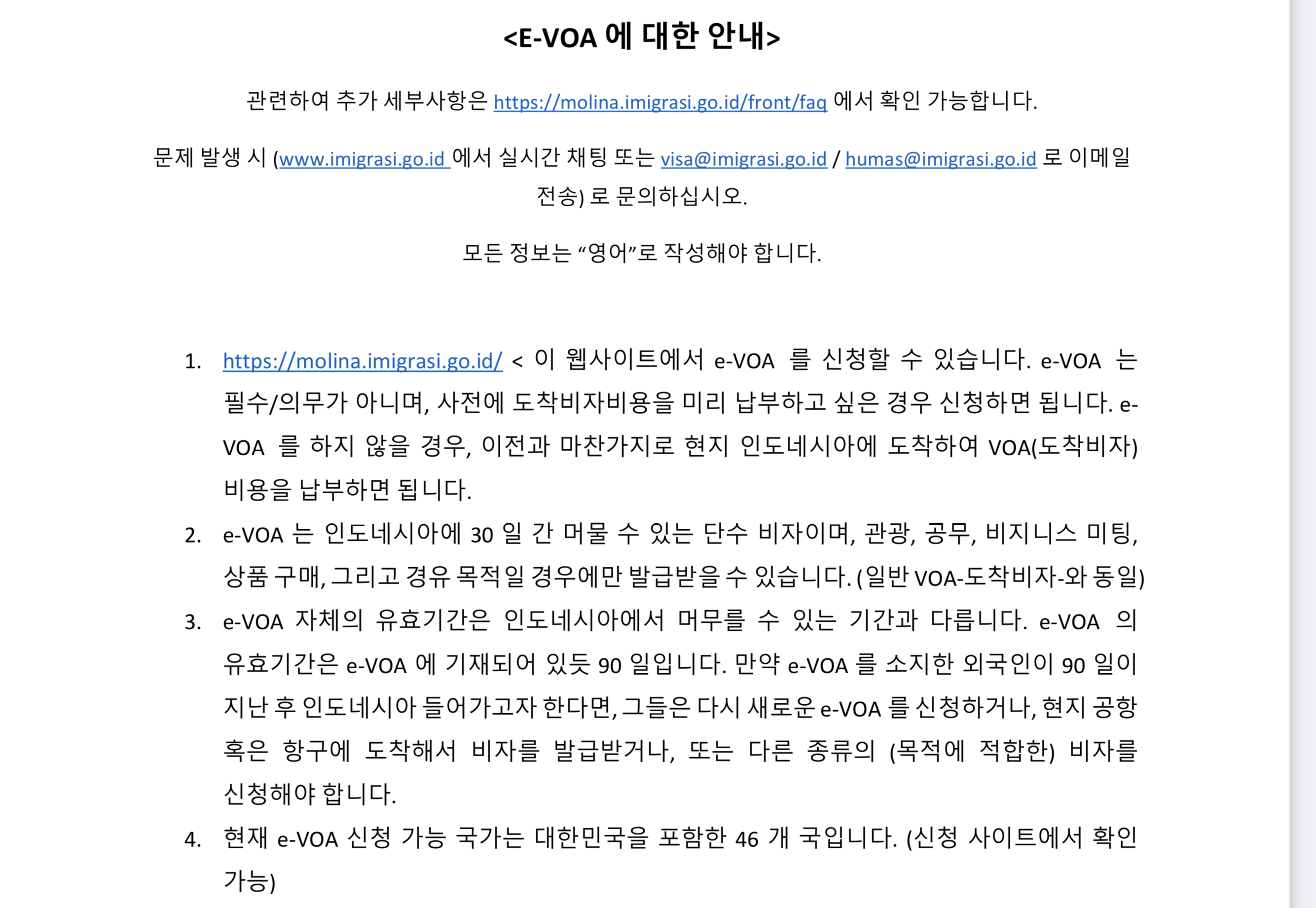 ![]() | molina.imigrasi.go.id 계정생성부터 활성화방법까지 아래 인도네시아 대사관 홈페이지 링크에 자세히 설명되어 있다. 출처 : 인도네시아 대사관 홈페이지 "https://www.ekbriseoul.kr/images/download/EVOA_Korean.pdf" |