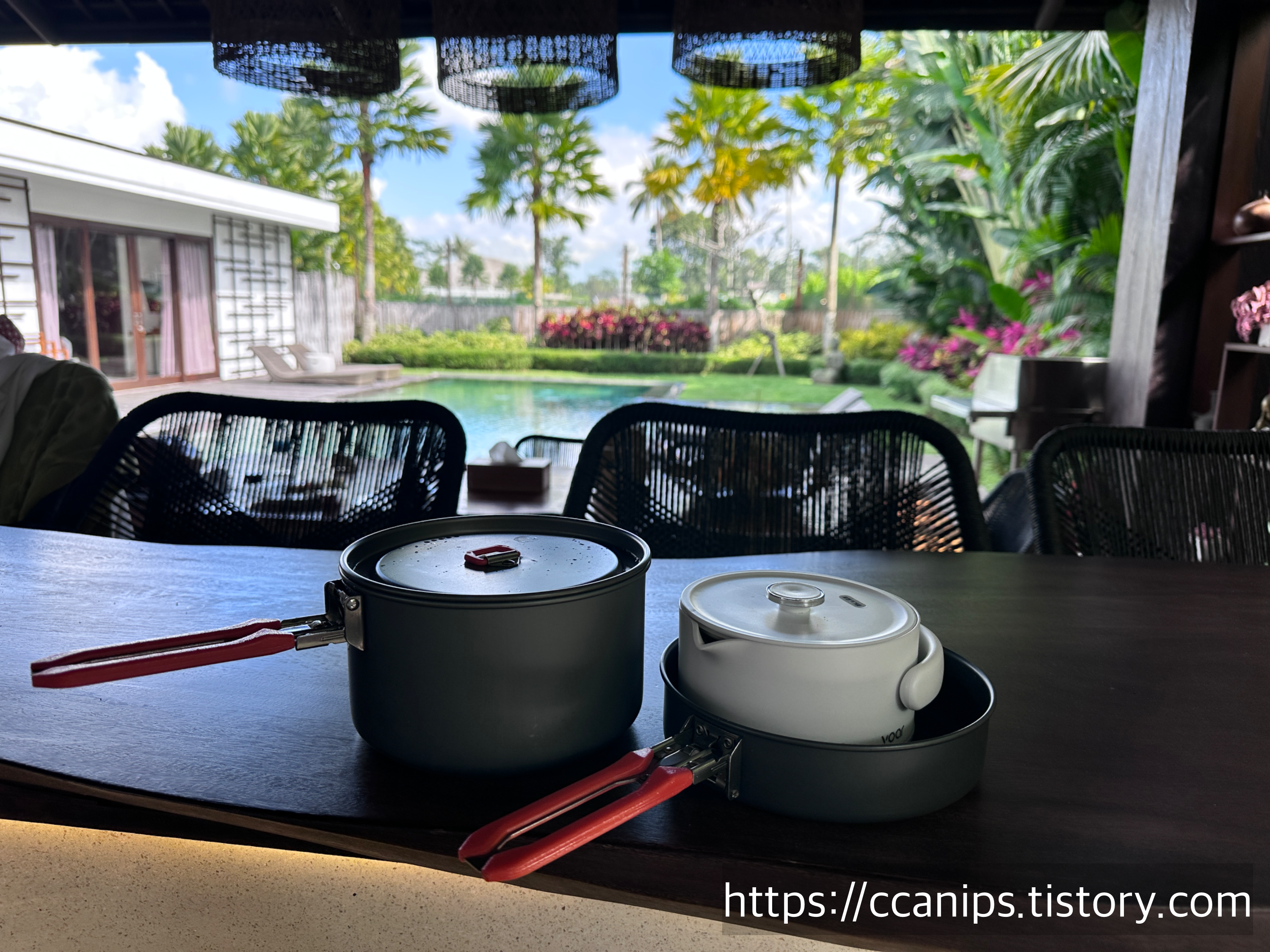 부피 작은 접이식주전자와 코펠.