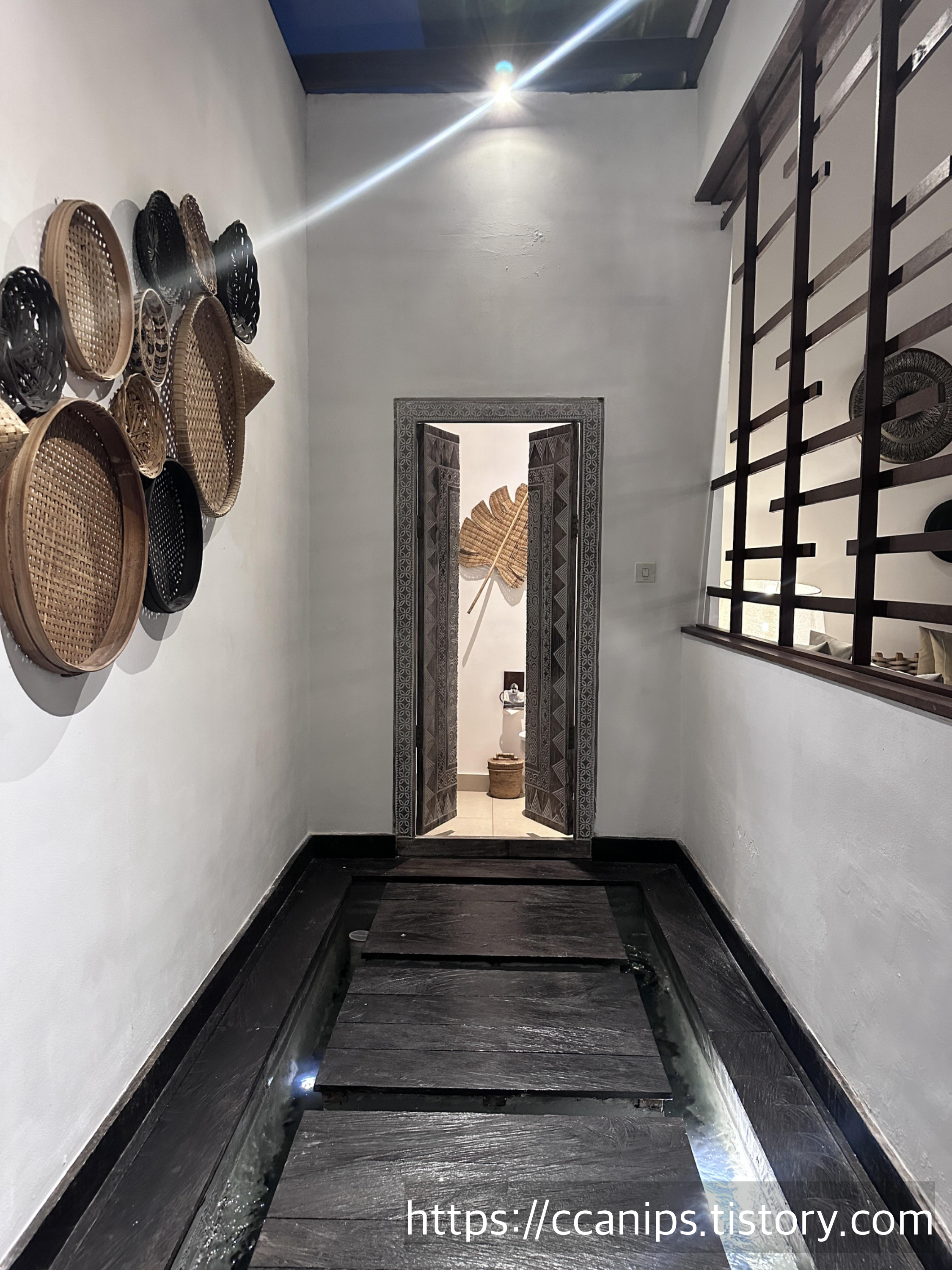야외거실 한켠 현관 바로 옆에도 화장실이 있다.