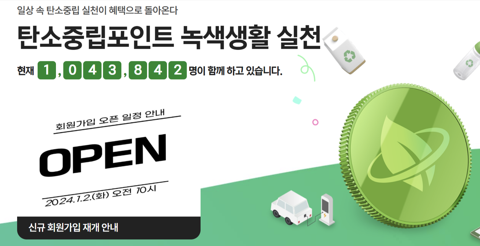 일상 속 탄소중립 실천이 혜택으로 돌아온다 탄소중립포인트 녹색생활 실천 현재 1043842명이 함께 하고 있습니다.