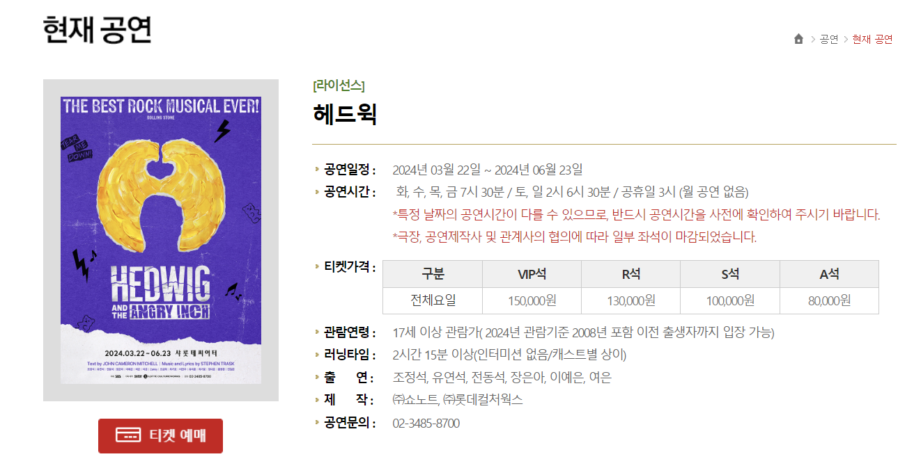헤드윅은 샤롯데씨어터에서 공연한다.